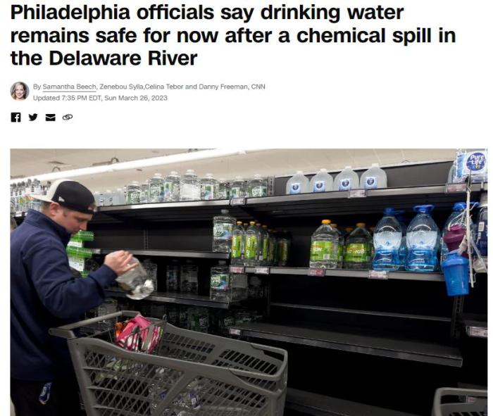中新網(wǎng)3月27日電 綜合外媒報道,近日,美國賓州布里斯托爾一家工廠發(fā)生泄漏事故,大量化學物質(zhì)流入特拉華河一條支流中。事故發(fā)生后,費城官員建議當?shù)孛癖娛褂闷垦b水,引發(fā)恐慌性購買。