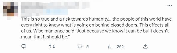 在網(wǎng)絡(luò)上,這封信也引起熱烈討論,有網(wǎng)友表示認(rèn)同,人們需要知道發(fā)生了什么,“僅僅因?yàn)槲覀冎揽梢越ㄔ焖?,并不意味著?yīng)該建造”。