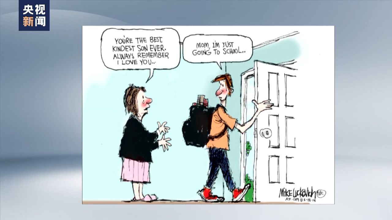 槍支暴力已經(jīng)成為美國(guó)孩子的“頭號(hào)殺手”。在這幅漫畫(huà)中,母親流著眼淚,對(duì)準(zhǔn)備出門(mén)上學(xué)的孩子叮囑道,“你是最好、最善良的兒子,永遠(yuǎn)要記得這一點(diǎn),我愛(ài)你?!?孩子則有點(diǎn)疑惑地說(shuō),“媽媽,我只是去學(xué)校?!?這就是校園槍擊案頻發(fā)令無(wú)數(shù)父母終日膽戰(zhàn)心驚的真實(shí)寫(xiě)照。