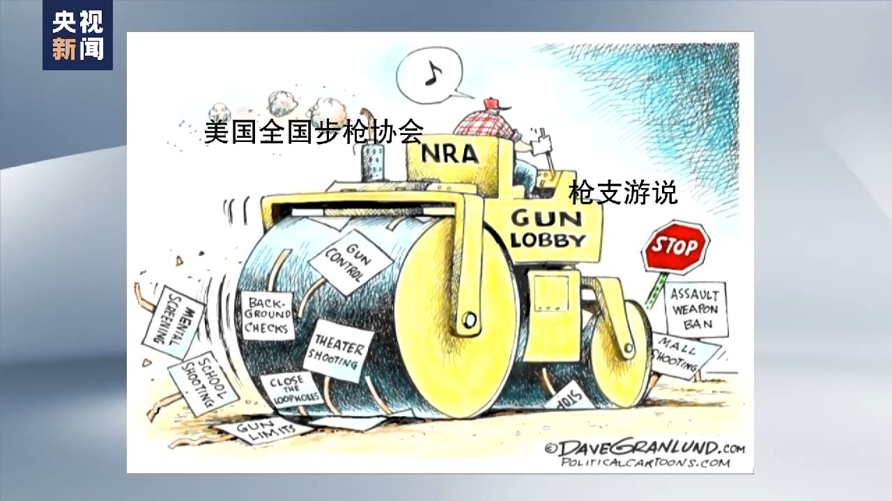 在這幅漫畫(huà)中,一名男子聽(tīng)著音樂(lè),漫不經(jīng)心地開(kāi)著一輛寫(xiě)有“美國(guó)全國(guó)步槍協(xié)會(huì)”、“槍支游說(shuō)”字樣的壓路機(jī)一路向前,撞倒了前方赫然在目的“停止”標(biāo)志。在他身后,“攻擊性武器禁令”、“控槍”、“背景調(diào)查”等標(biāo)志被一一碾壓,接二連三發(fā)生的“校園槍擊”、“劇院槍擊”、“商場(chǎng)槍擊”等慘痛事件也完全被無(wú)視。