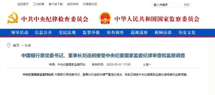 據中央紀委國家監(jiān)委網站3月31日消息,中國銀行原黨委書記、董事長劉連舸涉嫌嚴重違紀違法,目前正接受中央紀委國家監(jiān)委紀律審查和監(jiān)察調查。