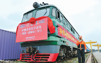 圖為2022年江西首列中俄雙向?qū)﹂_(kāi)班列(南昌—莫斯科)在南昌向塘國(guó)際陸港準(zhǔn)備出發(fā)。