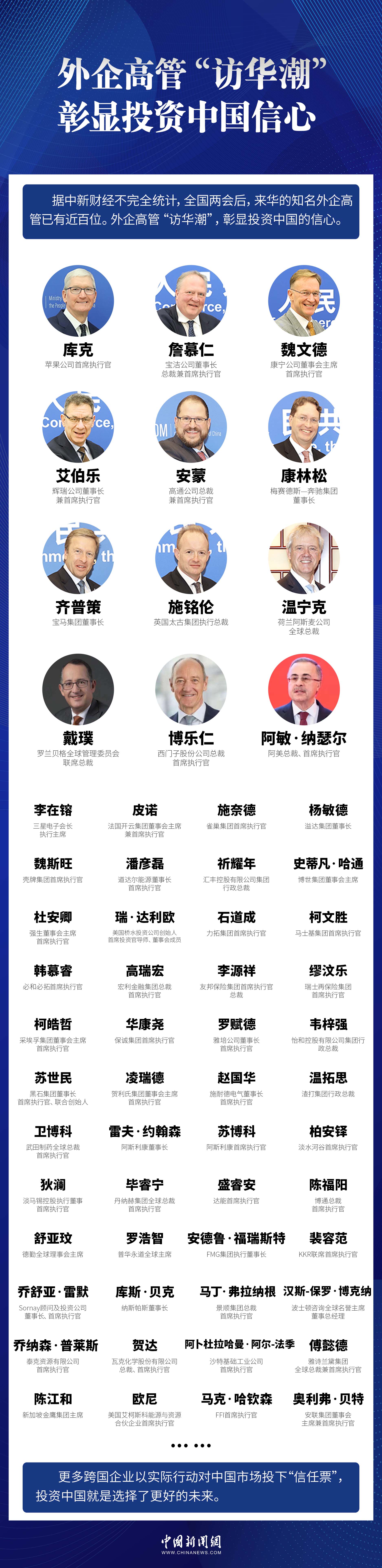 中新網(wǎng)北京4月7日電 (記者 李金磊)時(shí)下,外企高管正掀起“訪華潮”。據(jù)中新財(cái)經(jīng)不完全統(tǒng)計(jì),全國兩會后,來華的知名外企高管已有近百位。