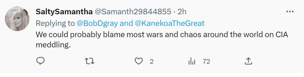 網友“有趣的薩曼莎”說:“世界上絕大多數的戰(zhàn)爭和混亂都是美國中央情報局帶來的吧?!?/p>