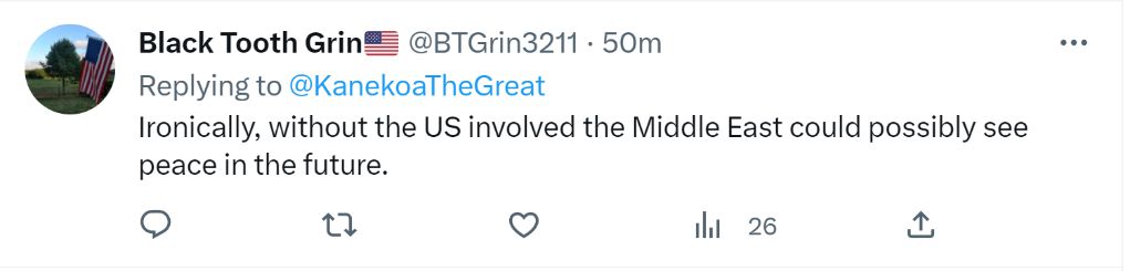一名自我介紹是美國退役軍人的網友“現身說法”:“真諷刺,沒有美國摻和,中東或許未來就會實現和平。