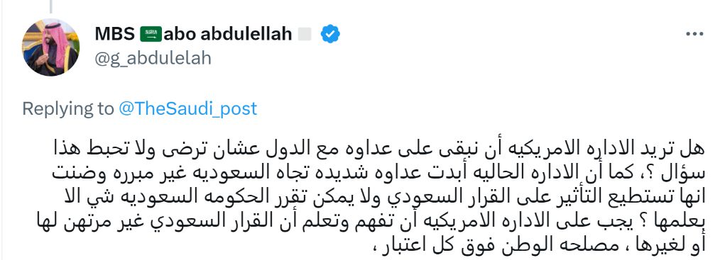 沙特網友阿博·阿卜杜勒拉言辭激烈地批評:“只有我們與其他國家保持敵意美國才不會失望嗎?美國政府對沙特表現出強烈而無理的敵意,居然還認為它可以影響沙特的決定、沙特只能在它的指導下做事?美國政府必須了解,沙特的決定不依附于任何其他人。祖國的利益高于一切。