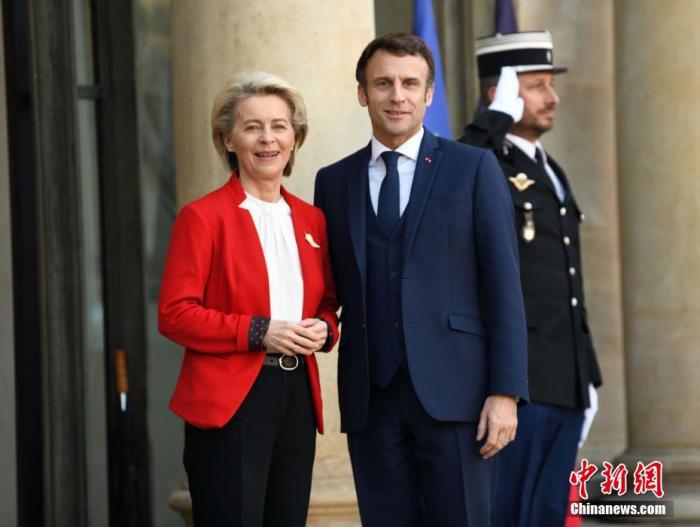 資料圖:法國(guó)總統(tǒng)馬克龍與歐盟委員會(huì)主席馮德萊恩。中新社記者 李洋 攝