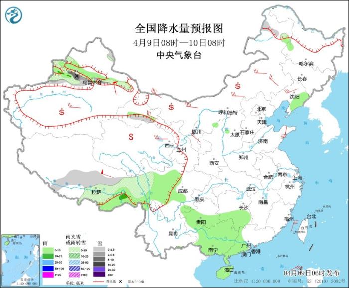 4月9日08時至10日08時,新疆沿天山地區(qū)、西藏南部和東部、甘肅河西、川西高原北部、內(nèi)蒙古東北部等地部分地區(qū)有小到中雪或雨夾雪,其中,新疆天山山區(qū)的高海拔地區(qū)有中到大雪(5~9毫米)。西藏東南部、四川盆地西部、貴州中南部、湖南南部、廣西大部、廣東西部、海南島大部、遼寧東部等地部分地區(qū)有小雨,其中,新疆伊犁河谷、西藏東南部等地部分地區(qū)有中雨。內(nèi)蒙古中西部、新疆南疆盆地、西北地區(qū)北部、遼寧西部、山東半島等地部分地區(qū)有4~6級風,其中,內(nèi)蒙古西北部部分地區(qū)有6~7級風,新疆東部、西藏中部等地部分地區(qū)有7~8級風。臺灣海峽、南海北部和中部、巴士海峽將有6~7級、陣風8級的東北風。