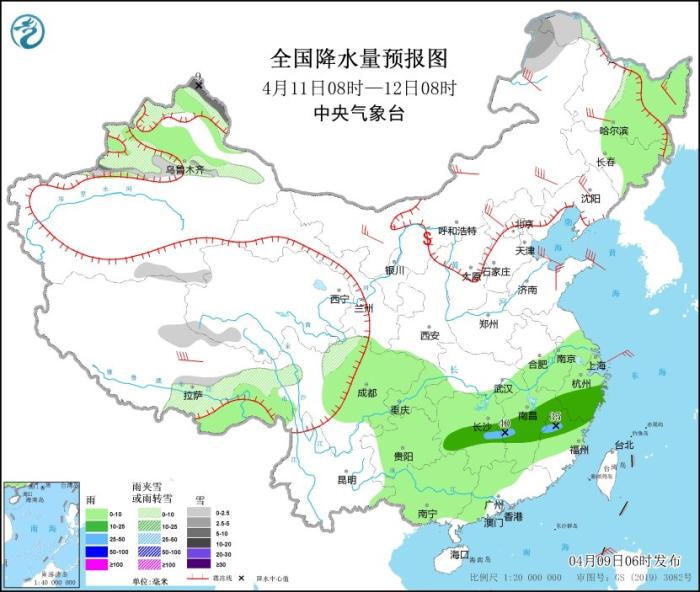 4月11日08時至12日08時,新疆北疆北部和沿天山地區(qū)、內(nèi)蒙古東北部、黑龍江西北部、西藏東部和南部、青海西部、川西高原北部等地部分地區(qū)有小到中雪或雨夾雪,其中,新疆阿勒泰北部等地部分地區(qū)有中到大雪(5~9毫米)。東北地區(qū)東部、西藏東南部、西南地區(qū)東部、江淮大部、江南、華南西部和北部等地部分地區(qū)有小到中雨,其中,湖南中部、江西中部、福建西北部等地部分地區(qū)有大雨(25~40毫米)。內(nèi)蒙古中東部、東北地區(qū)大部、華北東北部、山東半島等地部分地區(qū)有4~6級風,其中,內(nèi)蒙古東部、西藏中部等地部分地區(qū)有6~7級風。
