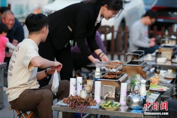 各地食客在淄博品嘗燒烤。梁犇 攝