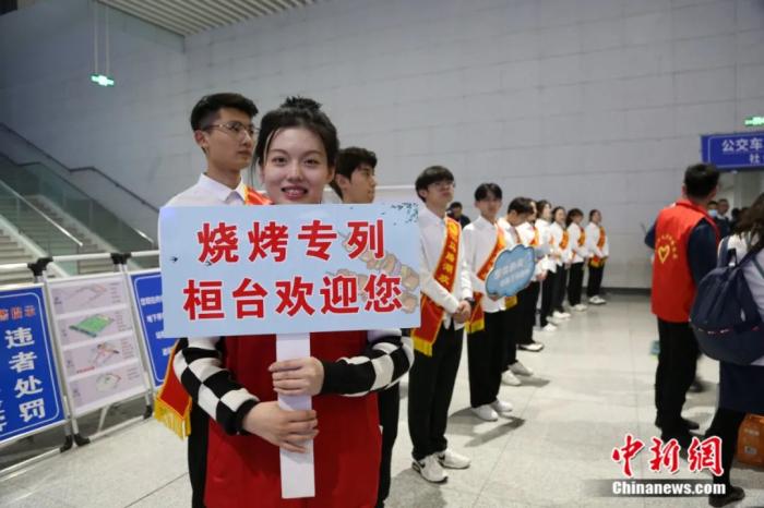 淄博志愿者在車(chē)站歡迎燒烤專(zhuān)列旅客。梁兆福 攝