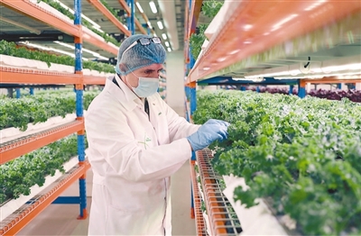 走進農場,記者如同進入一座實驗室——進入車間需要經過兩道門,工作人員均身著白大褂、戴著手套和發(fā)套;又像來到一個大型倉儲市場——一排排貨架上,整齊擺放著各種蔬菜,工作人員有時需要踩著梯子取放物品。農場生產經理羅伯特·費洛斯說,這里更像一個現代化的生產車間,溫度、濕度、光照都進行自動化控制,為蔬菜提供更精準、更高效的生長環(huán)境。