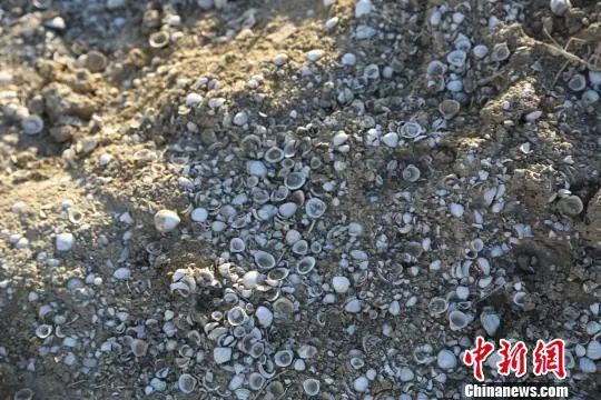 貝殼同含有鹽堿的泥沙凝結(jié)在一起,層層疊疊,千姿百態(tài),是迄今為止中國(guó)內(nèi)陸盆地發(fā)現(xiàn)的最大規(guī)模的古生物地層。