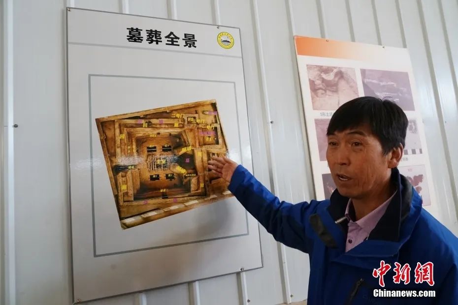 都蘭縣博物館館長(zhǎng)張杲光介紹熱水墓群2018血渭一號(hào)墓。馬銘言 攝