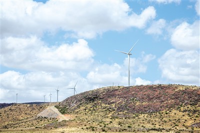 在南非北開普省德阿鎮(zhèn),中國龍源電力集團南非公司運營的德阿風(fēng)電項目風(fēng)機。