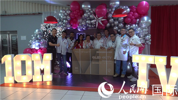 中巴員工利用午飯空閑時(shí)間一起紀(jì)念第1000萬臺(tái)電視機(jī)下線。人民網(wǎng)記者吳杰 攝