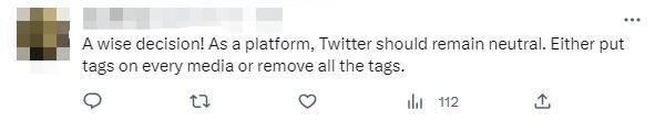 對(duì)推特的最新變化,有網(wǎng)友表示歡迎?!耙粋€(gè)明智的決定!作為一個(gè)平臺(tái),推特應(yīng)該保持中立。要么給每個(gè)媒體上都打標(biāo)簽,要么刪除所有標(biāo)簽?!?/p>
