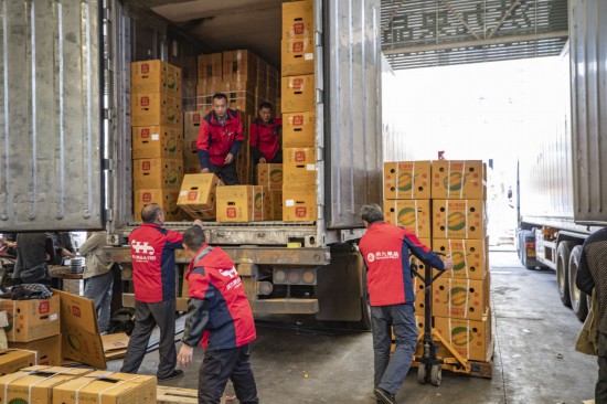 在重慶市江津區(qū)雙福農(nóng)貿(mào)城,洪九果品的工作人員在搬運(yùn)從泰國(guó)運(yùn)輸過來的榴蓮(2022年4月19日攝)。新華社記者 黃偉 攝
