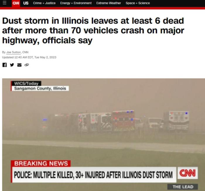 警方表示,北行和南行的方向上都有事故發(fā)生,事故原因是“強(qiáng)風(fēng)卷著農(nóng)田中的泥土吹過(guò)公路,使當(dāng)時(shí)的能見(jiàn)度將至零”。