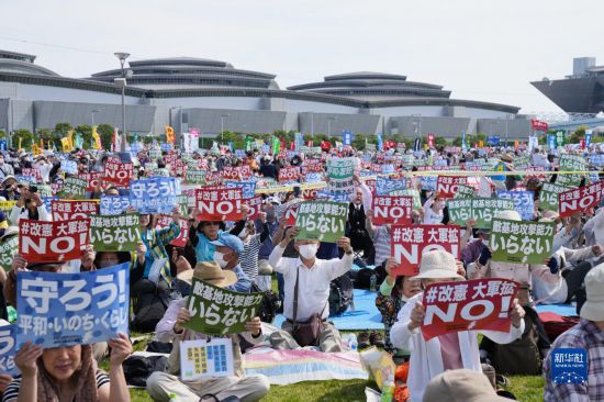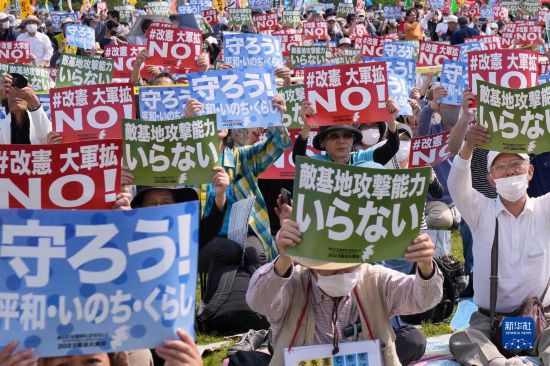 5月3日是日本憲法紀(jì)念日。當(dāng)天,約2.5萬名日本民眾聚集在東京有明防災(zāi)公園的廣場上,舉行了守護(hù)憲法集會,他們打出守護(hù)憲法、反對強(qiáng)軍擴(kuò)武、不要反擊能力、反對修改憲法等內(nèi)容的標(biāo)語和旗幟,呼吁守護(hù)憲法、守護(hù)和平。