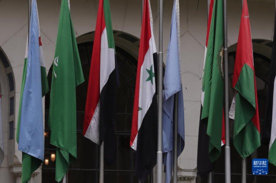 這是5月7日在位于埃及開羅的阿拉伯國家聯(lián)盟總部拍攝的敘利亞國旗(左四)。新華社發(fā)(艾哈邁德·戈馬 攝)