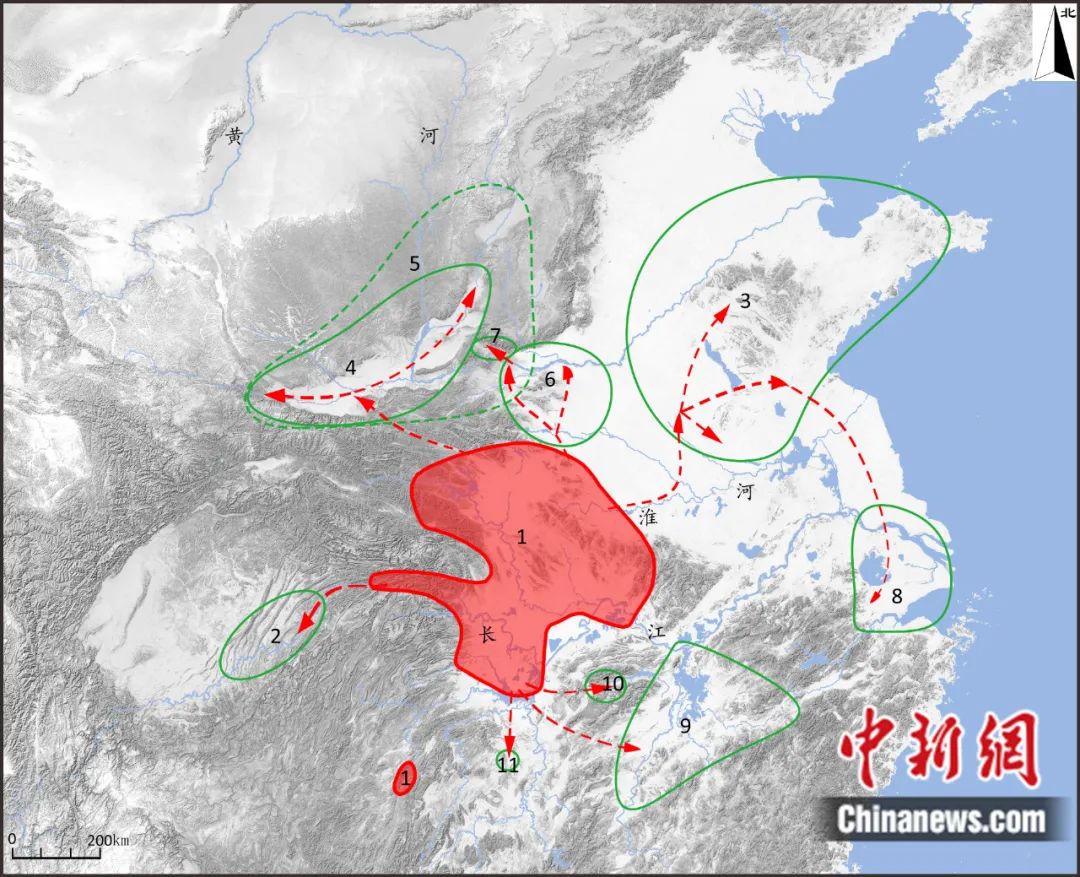 屈家?guī)X文化對(duì)外擴(kuò)張路線示意圖(紅色區(qū)域?yàn)榍規(guī)X文化主要分布范圍)。受訪者 供圖