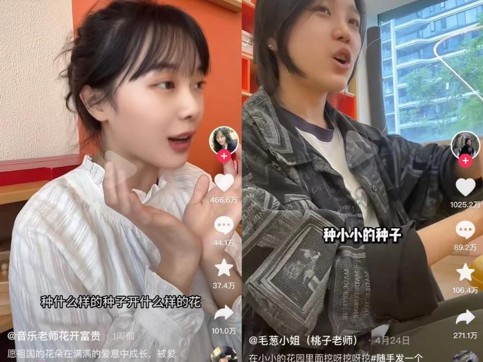 中新網(wǎng)查詢(xún)了她們?cè)诙桃曨l平臺(tái)上最早發(fā)布時(shí)間,桃子老師是在4月24日,黃老師是在4月28日。