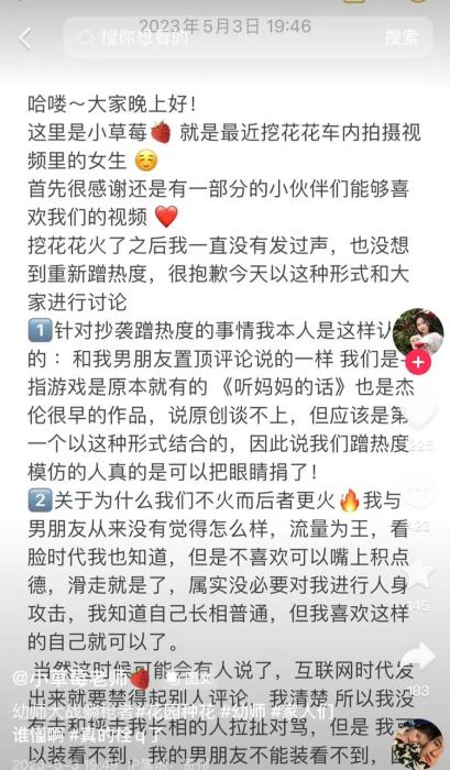“小草莓老師”也在5月3日發(fā)文回應(yīng)稱(chēng),不存在誰(shuí)是原創(chuàng)的問(wèn)題。