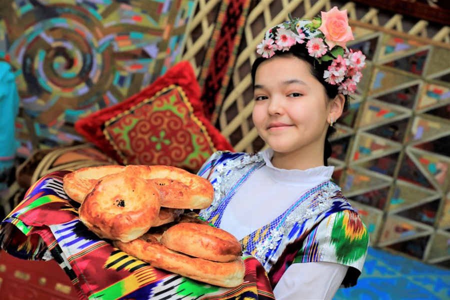 ↑身著民族服飾的哈薩克斯坦女孩在阿斯塔納展示傳統(tǒng)美食,迎接納烏魯斯節(jié)。