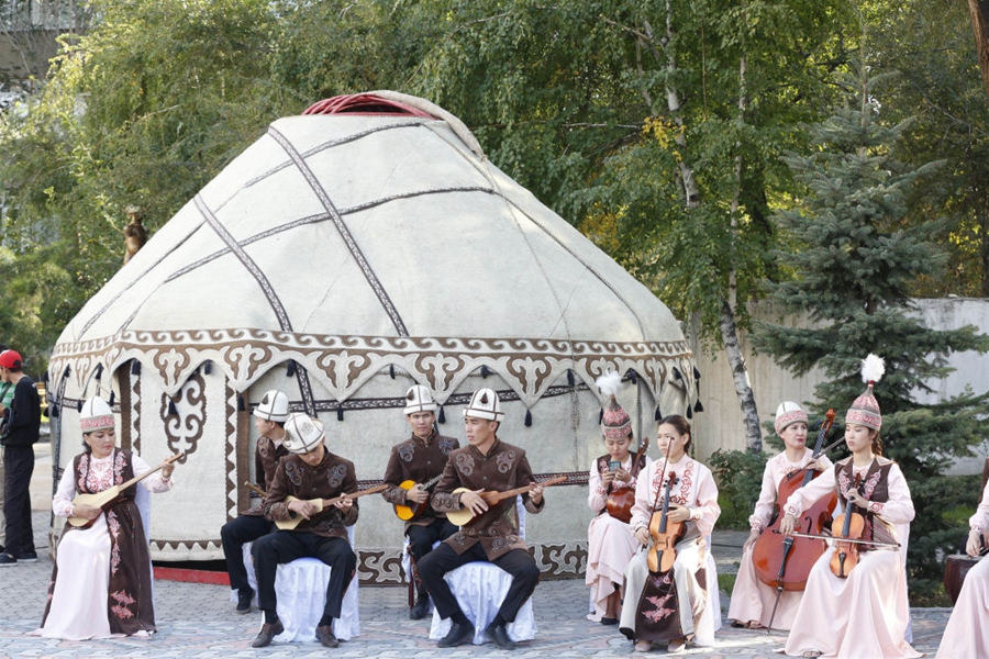 ↑身穿民族服飾的演奏者在吉爾吉斯斯坦首都比什凱克用傳統(tǒng)樂(lè)器合奏音樂(lè)。