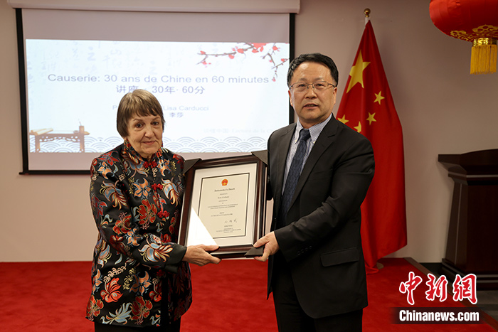 中新社蒙特利爾5月14日電 (記者 余瑞冬)加拿大著名作家、詩人、漢學家李莎·卡爾杜齊(Lisa Carducci)13日在中國駐蒙特利爾總領事館獲頒中國駐加拿大使館2022年度“大使獎”。