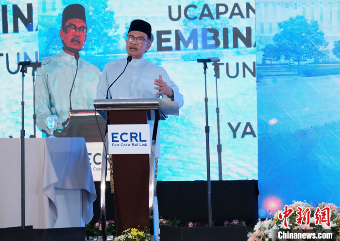 5月12日,馬來(lái)西亞?wèn)|海岸鐵路首個(gè)車站開工儀式在吉蘭丹州哥打巴魯舉行。馬來(lái)西亞總理安瓦爾出席儀式并致辭。 中新社記者 陳悅 攝