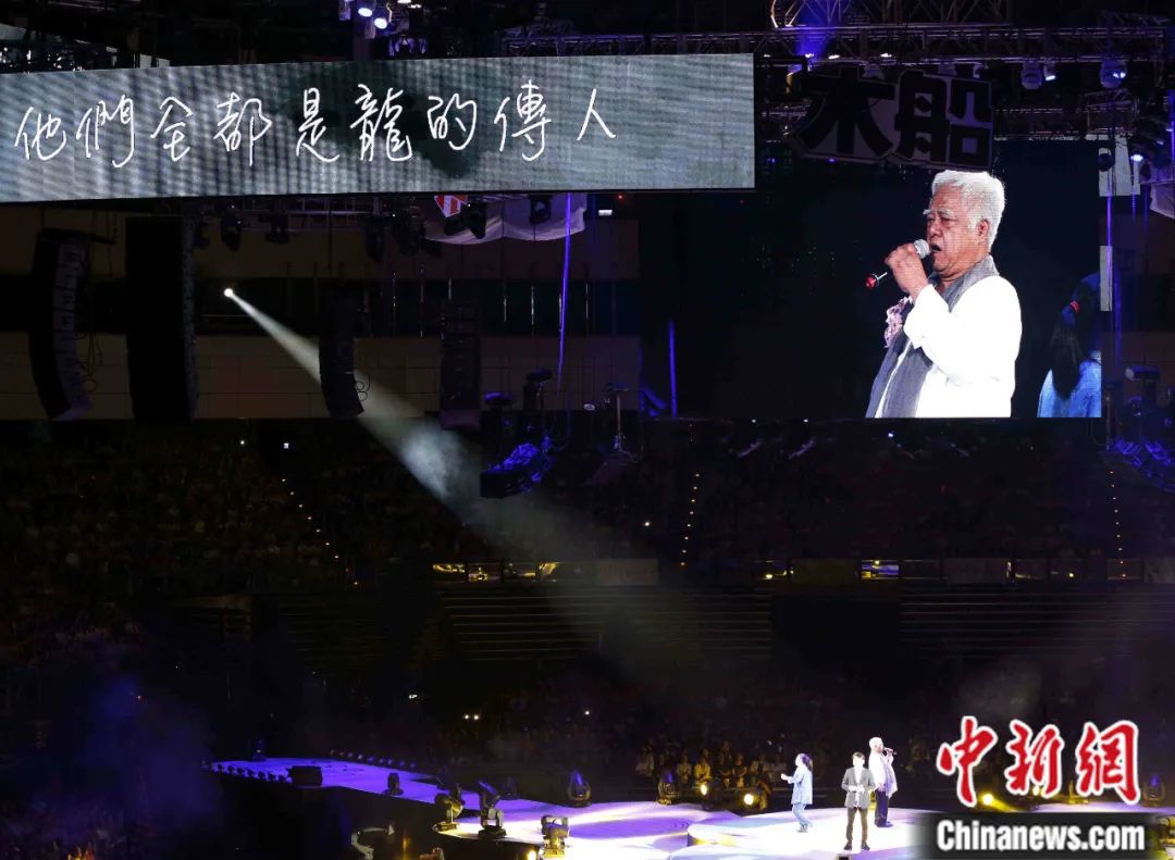 2015年6月,“民歌40:再唱一段思想起”演唱會在臺北小巨蛋舉行。包括齊豫、李宗盛、潘越云在內(nèi)的幾十位知名歌手齊聚一堂,共同紀(jì)念臺灣民歌運動興起40周年。圖為胡德夫等人合唱《龍的傳人》。鄭巧 攝