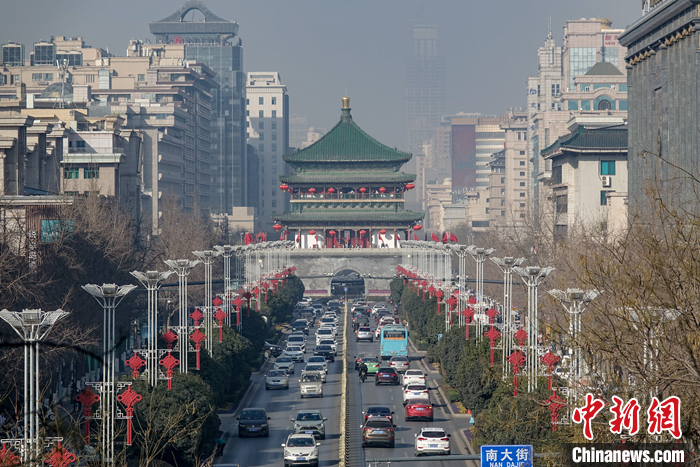 2023年1月7日,西安城墻永寧門,游覽城墻風(fēng)光的游客絡(luò)繹不絕,熙熙攘攘。圖為從永寧門城墻上遠(yuǎn)眺鐘樓。