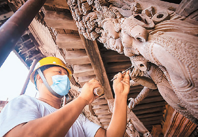 2022年,在國(guó)家文物局的指導(dǎo)下,中國(guó)文化遺產(chǎn)研究院援助尼泊爾工作隊(duì)經(jīng)過(guò)近5年努力,圓滿完成尼泊爾加德滿都杜巴廣場(chǎng)九層神廟建筑群文物本體維修。圖為2022年7月,工人在尼泊爾加德滿都進(jìn)行九層神廟建筑群修復(fù)工作。