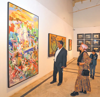 人們?cè)诎<笆锥奸_羅參觀“藝匯絲路——中阿知名藝術(shù)家采風(fēng)作品展”。