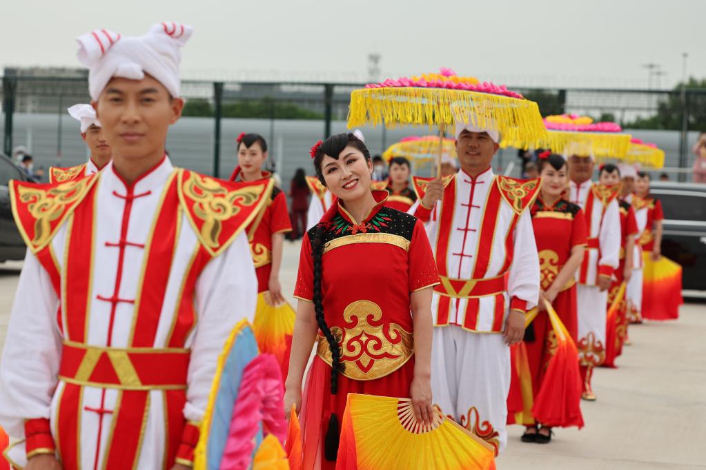 記者在西安咸陽國際機(jī)場(chǎng)看到,17日中午,由190人組成的表演團(tuán)隊(duì)已經(jīng)準(zhǔn)備就緒。當(dāng)?shù)孛癖妼⒁詿崆榈难摹g快的秧歌等民間藝術(shù)表演,歡迎來自中亞國家的貴賓。