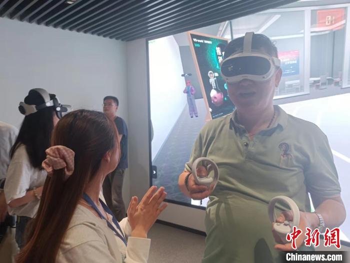 5月16日,體驗(yàn)者穿戴設(shè)備,在南京維賽客網(wǎng)絡(luò)科技有限公司體驗(yàn)元宇宙魅力。中新社記者 李夢(mèng) 攝