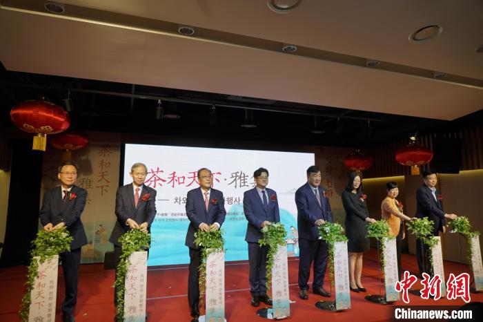 當?shù)貢r間23日,“茶和天下·雅集”活動開幕式暨茶韻山水——“綠水青山就是金山銀山”浙江省文旅圖片展在首爾中國文化中心舉行。圖為活動啟幕儀式。中新社記者 劉旭 攝