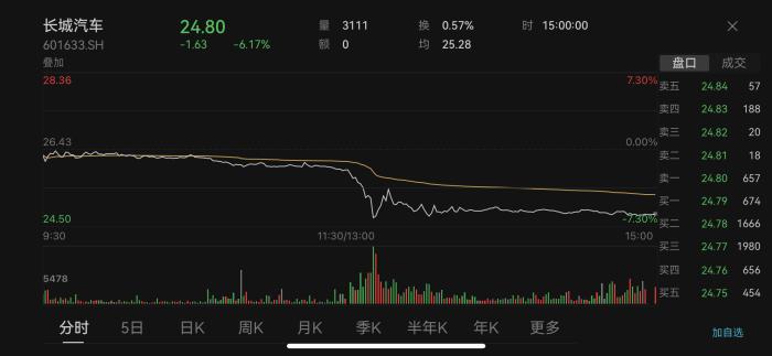 25日盤中,長城汽車一度跌超7%,比亞迪跌超2%。截至收盤,長城汽車股價報24.80元,下跌6.17%。比亞迪股價報255.60元,下跌2.41%。汽車整車板塊則下跌0.85%。有股民留言,“最慘的是同時擁有重倉長城汽車和比亞迪的股民,例如我,太慘了。”