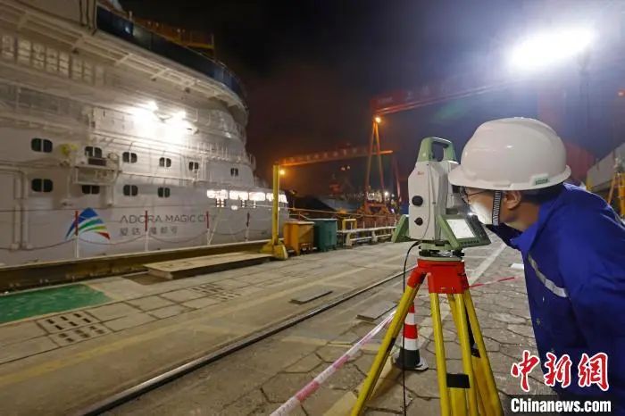 6月1日凌晨2時,中國首艘國產(chǎn)大型郵輪“愛達·魔都號”開始注水起浮,工作人員對船體相關(guān)數(shù)據(jù)進行檢測。殷立勤 攝