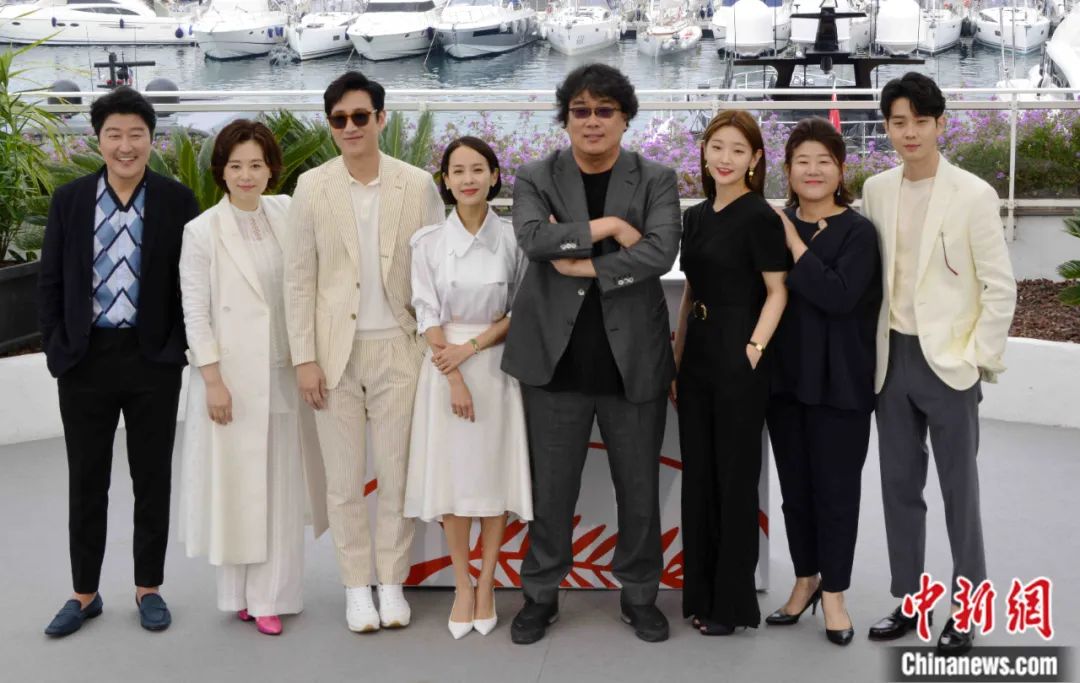 韓國(guó)影片《寄生蟲》主創(chuàng)團(tuán)隊(duì)亮相第72屆戛納電影節(jié)。李洋 攝