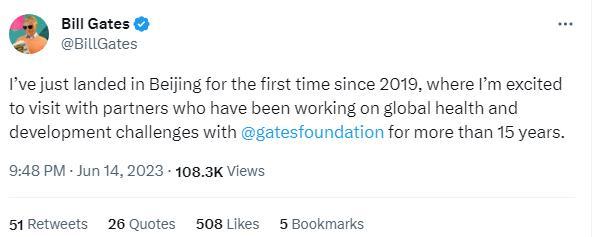 中新網(wǎng)6月14日電 北京時(shí)間14日,比爾及梅琳達(dá)·蓋茨基金會(huì)聯(lián)席主席兼理事、美國(guó)微軟公司聯(lián)合創(chuàng)始人比爾·蓋茨在社交媒體上發(fā)文稱已抵達(dá)北京。