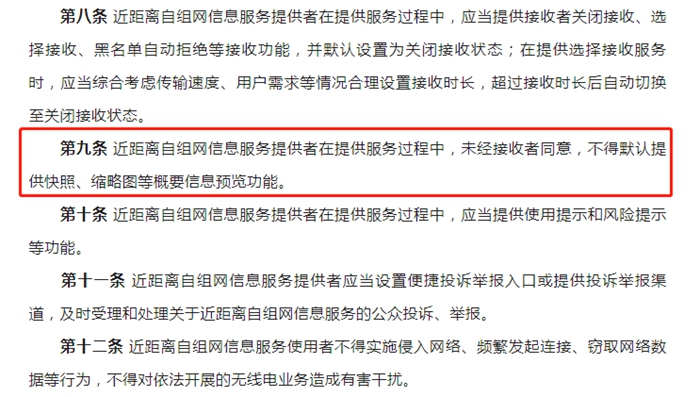 特別要注意的是,征求意見稿還提出“近距離自組網(wǎng)信息服務(wù)提供者在提供服務(wù)過程中,未經(jīng)接收者同意,不得默認(rèn)提供快照、縮略圖等概要信息預(yù)覽功能”。如前文所述,目前隔空投送存儲失敗選擇使用“文件”打開時,在未完全接收的情況下可顯示信息縮略圖。