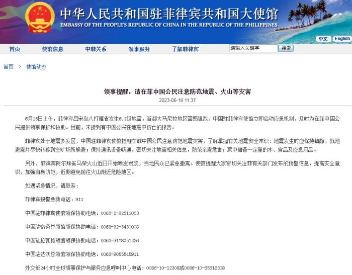 中新網(wǎng)6月16日電 據(jù)中國駐菲律賓大使館網(wǎng)站消息,6月15日上午,菲律賓呂宋島八打雁省發(fā)生6.2級地震,首都大馬尼拉地區(qū)震感強烈。中國駐菲律賓使館立即啟動應(yīng)急機制,及時為在菲中國公民提供領(lǐng)事保護和協(xié)助。目前,未接到有中國公民在地震中傷亡的報告。