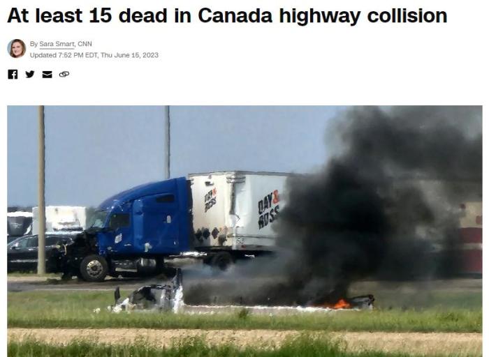 曼尼托巴省警官羅布·希爾表示,一輛載有大約25人的巴士在交叉路口與一輛半掛卡車相撞,至少15人確認(rèn)死亡,另有大約10人被送往醫(yī)院。希爾補(bǔ)充說,巴士上大多數(shù)是老年乘客。
