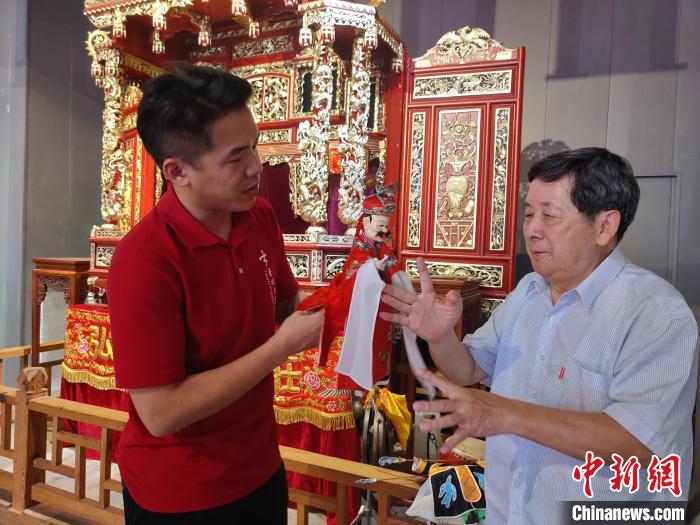 6月17日,在廈門(mén)舉行的海峽兩岸布袋木偶戲藝術(shù)節(jié)上,80歲的莊陳華(右一)正在指導(dǎo)吳聲杰(左一)表演布袋木偶戲?!≈行律缬浾?葉秋云 攝