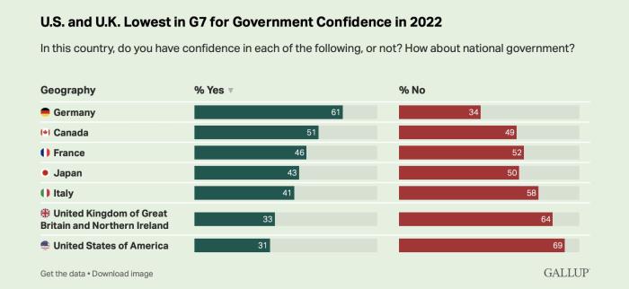 據(jù)《國會(huì)山報(bào)》當(dāng)?shù)貢r(shí)間7月3日?qǐng)?bào)道,根據(jù)蓋洛普最新發(fā)布的一項(xiàng)針對(duì)七國集團(tuán)政府信心指數(shù)的民意調(diào)查顯示,美國和英國獲得的信心指數(shù)最低。