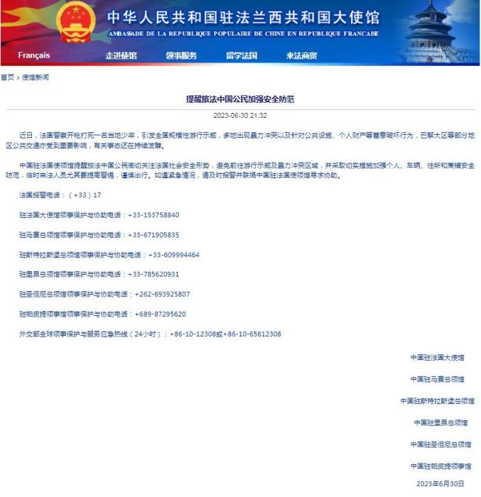 中新網(wǎng)7月1日電 據(jù)中國駐法國大使館當(dāng)?shù)貢r間6月30日消息,法國警察開槍射殺少年事件,在法國引發(fā)全國規(guī)模性游行示威,事態(tài)持續(xù)發(fā)酵,中國駐法國大使館提醒旅法中國公民加強(qiáng)安全防范。