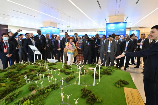 7月6日,駐華使節(jié)在國機集團國際化經(jīng)營成果展廳內(nèi)參觀由該集團承建的肯尼亞基佩托風電項目沙盤。新華社記者 李鑫 攝